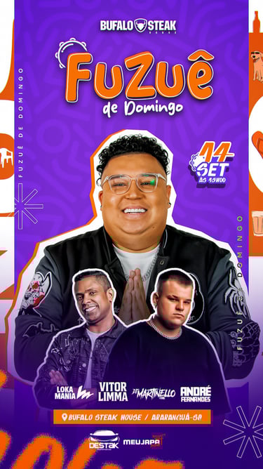 Dia 14 de Setembro tem a terceira e maior edição do Fuzuê de Domingo na Búfalo Steak House, muito pagode com Vitor Limma e Loka Mania em um lindo climinha de domingo.